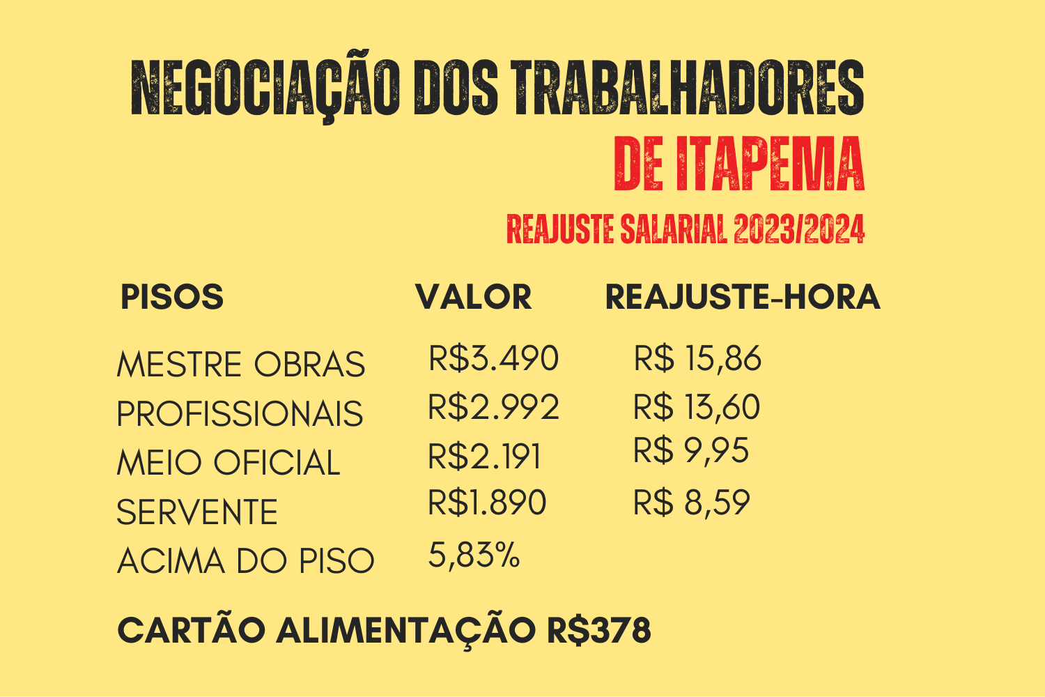 A Convenção Coletiva de Trabalho - CCT dos trabalhadores da construção civil de Itapema que vai vigorar durante 1º de maio 2023 a 30 de abril 2024, já foi fechado pelo Sindicato dos Trabalhadores no Mobiliário e Construção Civil de Balneário Camboriú, Camboriú e Itapema – Siticom BC. A nova CCT traz reajuste em todos os salários e manutenção de importantes cláusulas sociais.