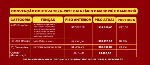 A Convenção Coletiva de Trabalho - CCT dos trabalhadores da construção civil de Balneário Camboriú e Camboriú, que vai vigorar durante 1º de maio 2024 a 30 de abril 2025, foi fechada pelo Siticom. A nova CCT traz reajuste em todos os salários.